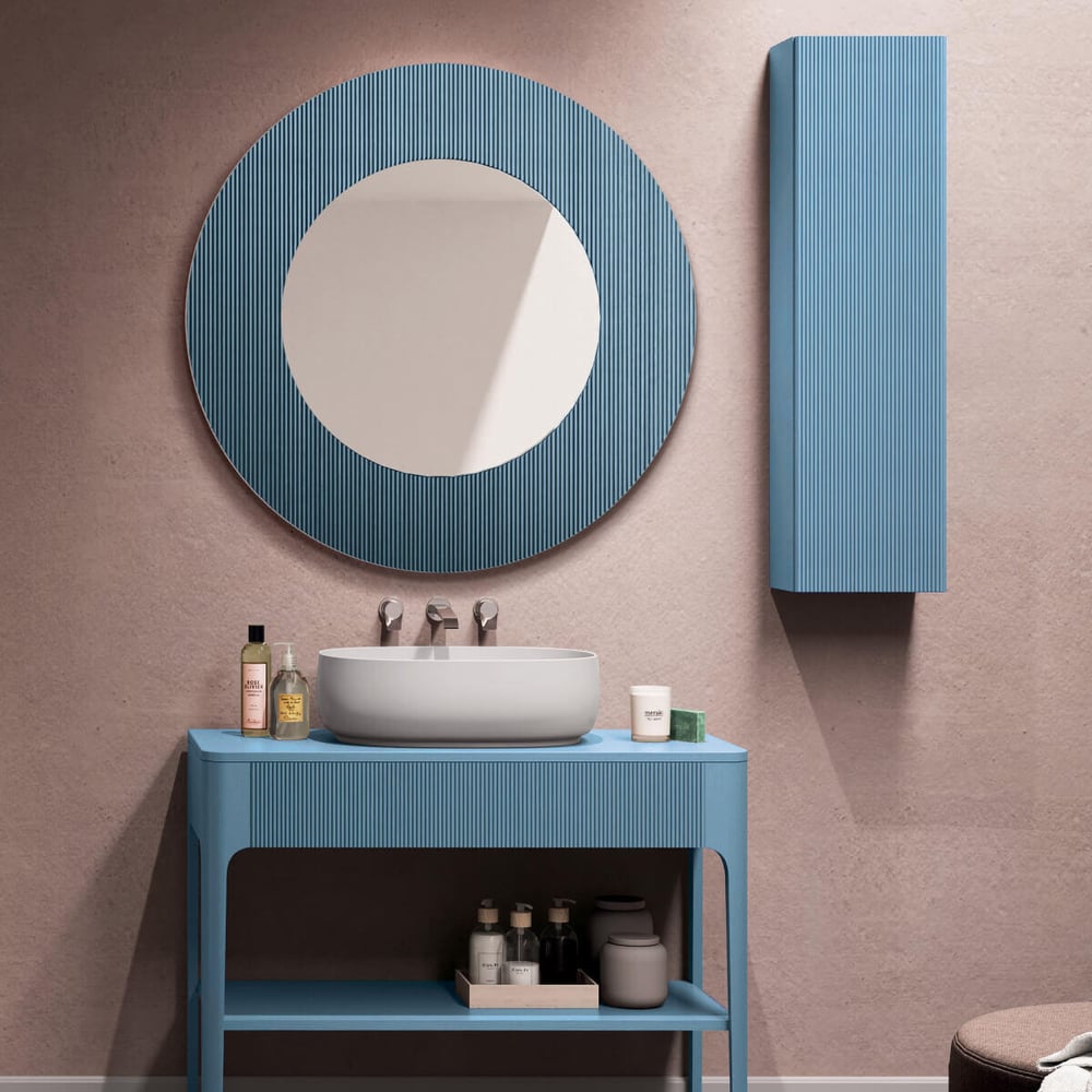 Available in rectangular, square, round, teardrop, and oval shapes, this mirror features a playful circular accent to complement the DOT vanity collection.