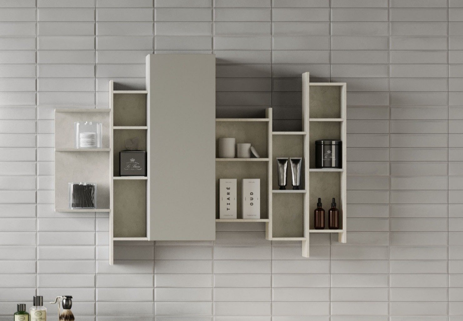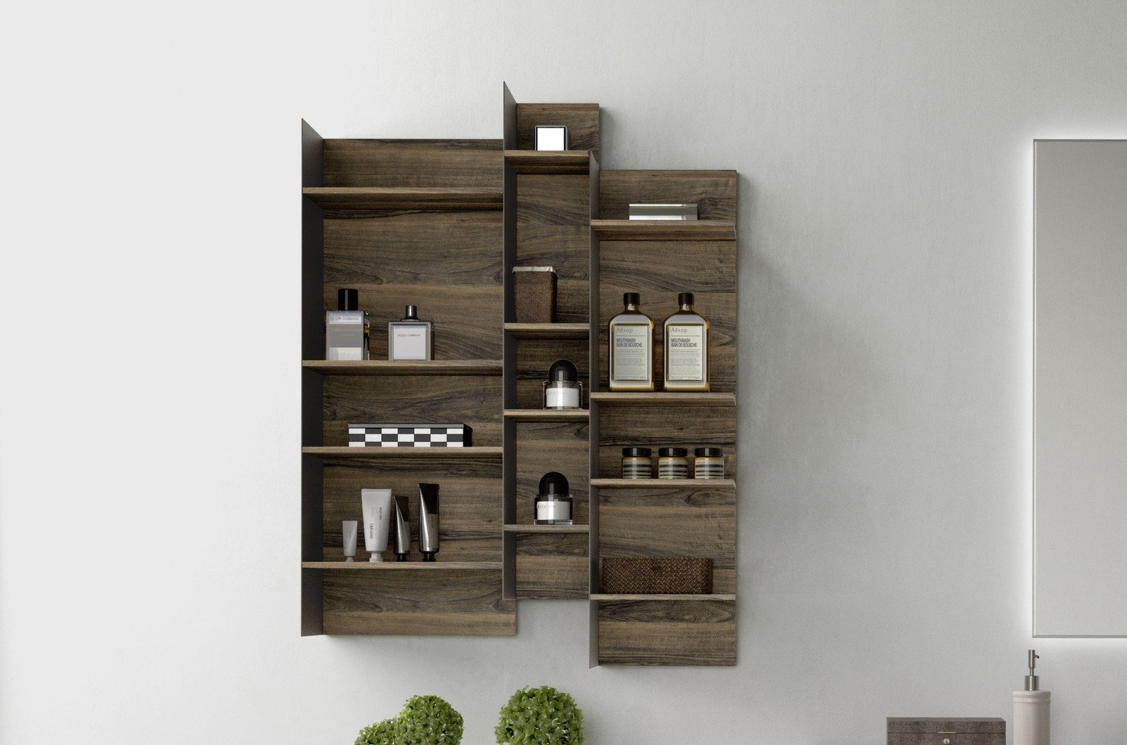 Add panache to your bathroom with this exclusive wall-mounted storage solution with built-in open shelves and an angular back panel.