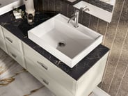 This integrated black glass countertop dramatically oozes ultra-luxe. The monochrome look makes it the anchor point for the room. While the gentle taper of the basin interior complements the beveled drawer detail below with gold fixtures that add a stylish flair.