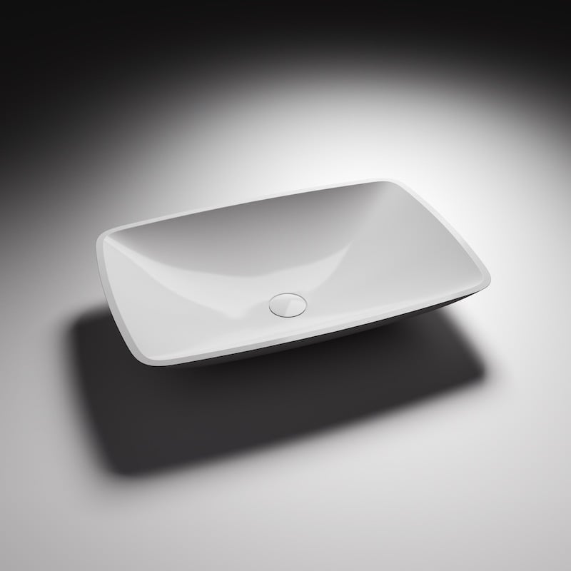 A finely detailed rectangular vessel basin with a slim, modern profile and bi-color possibilities